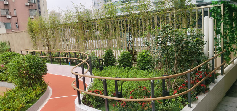 同時,頂樓設有屋頂康復花園,采用了我們公司提供的能隨處折彎的室外抗菌扶手。如圖二/圖三: